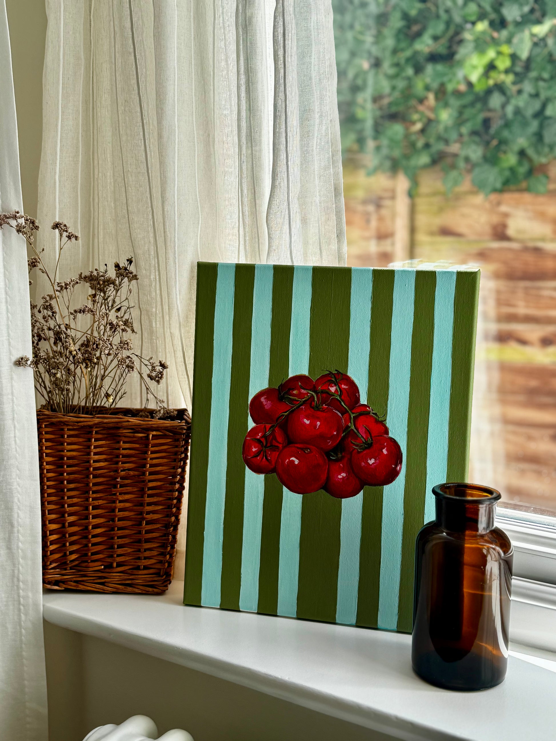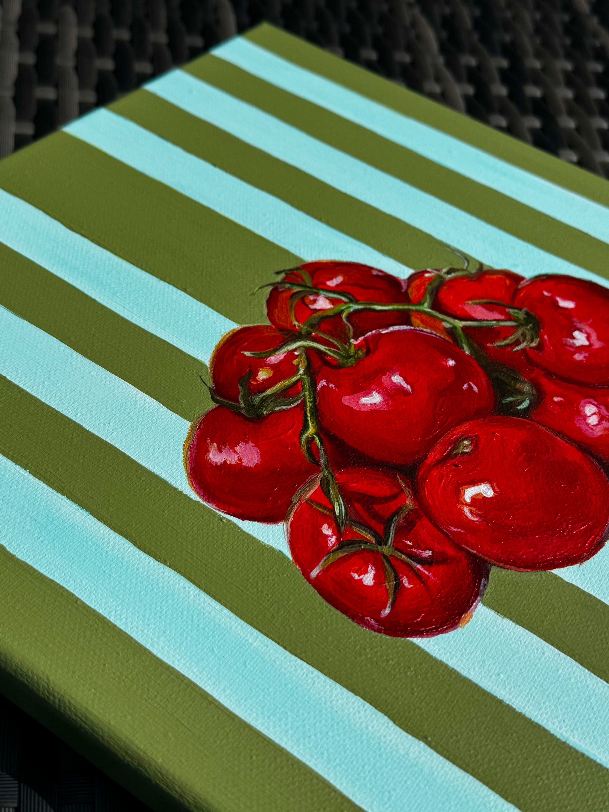 A burst of lively, ripe tomatoes set on vivid green and blue stripes